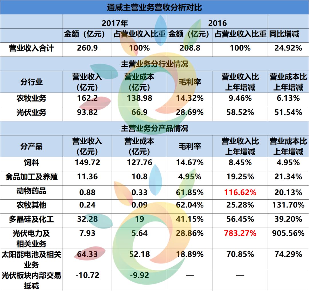 3月29日晚,通威股份发布2017年年报,公司2017年实现营业收入260.9亿元,同比增长 24.92%;实现归属于上市公司股东的净利润 20.12亿元,同比增长 96.35%。