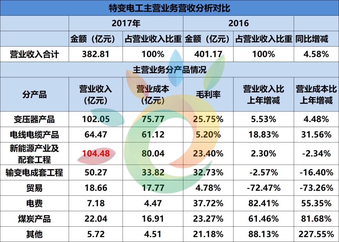 4月16日,特变电工发布2017年年报,公司2017年1-12月实现营业收入382.81亿元,同比下降4.58%;电气设备行业平均营业收入增长率为12.52%;归属于上市公司股东的净利润21.96亿元,同比增长0.25%,电气设备行业平均净利润增长率为16.57%,公司每股收益为0.61元。